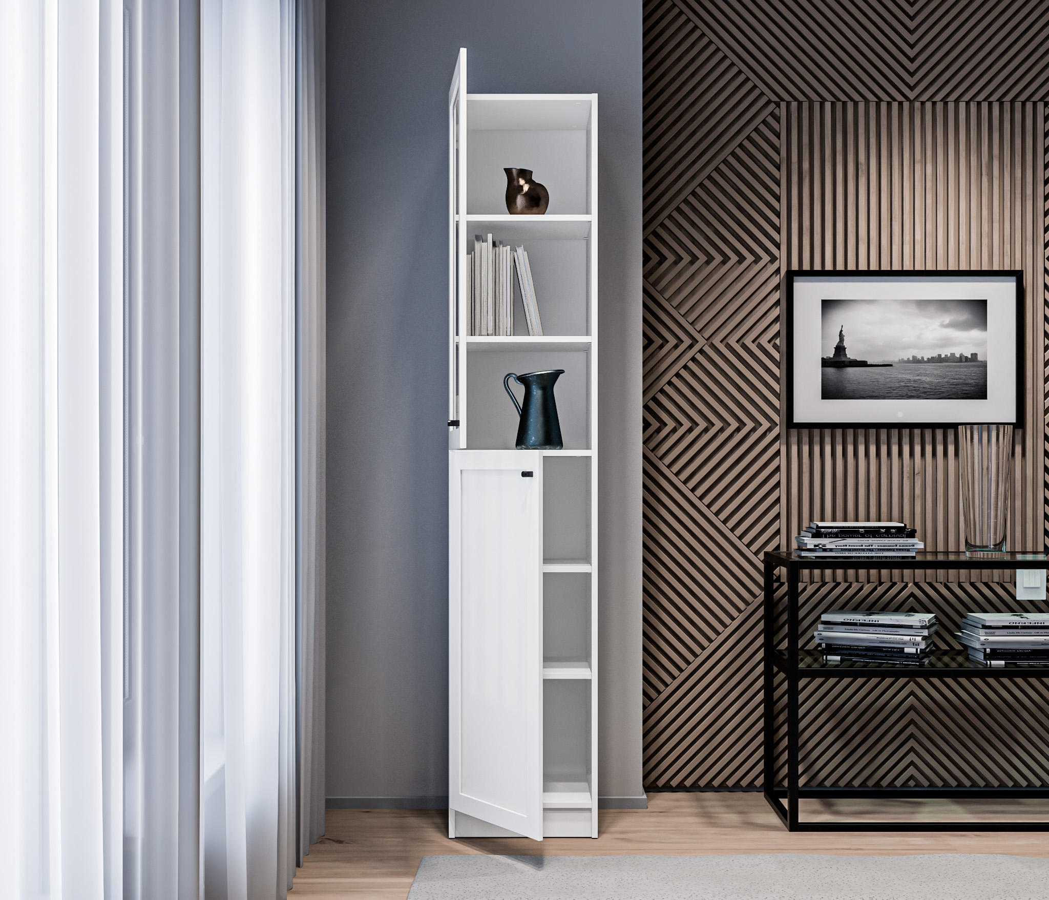 МС Твин предоставляет возможность собрать шкаф или стеллаж по своему вкусу. Вы сами выбираете размеры, цвет ручек: белый или черный, наполнение: ящик или полки. Помимо этого, вы можете решить, оставить фасады глухими или выбрать стеклянные, чтобы добавить прозрачности и легкости в ваш интерьер. Создайте шкаф-стеллаж, который идеально подходит для ваших потребностей и вписывается в ваш стиль.
