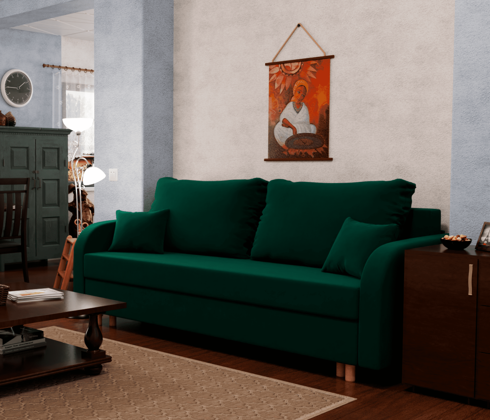 Механизм трансформации "еврокнижка" позволяет легко превратить диван в кровать, что делает его более практичным в использовании. Диван-кровать может использоваться как для сидения, так и для сна.